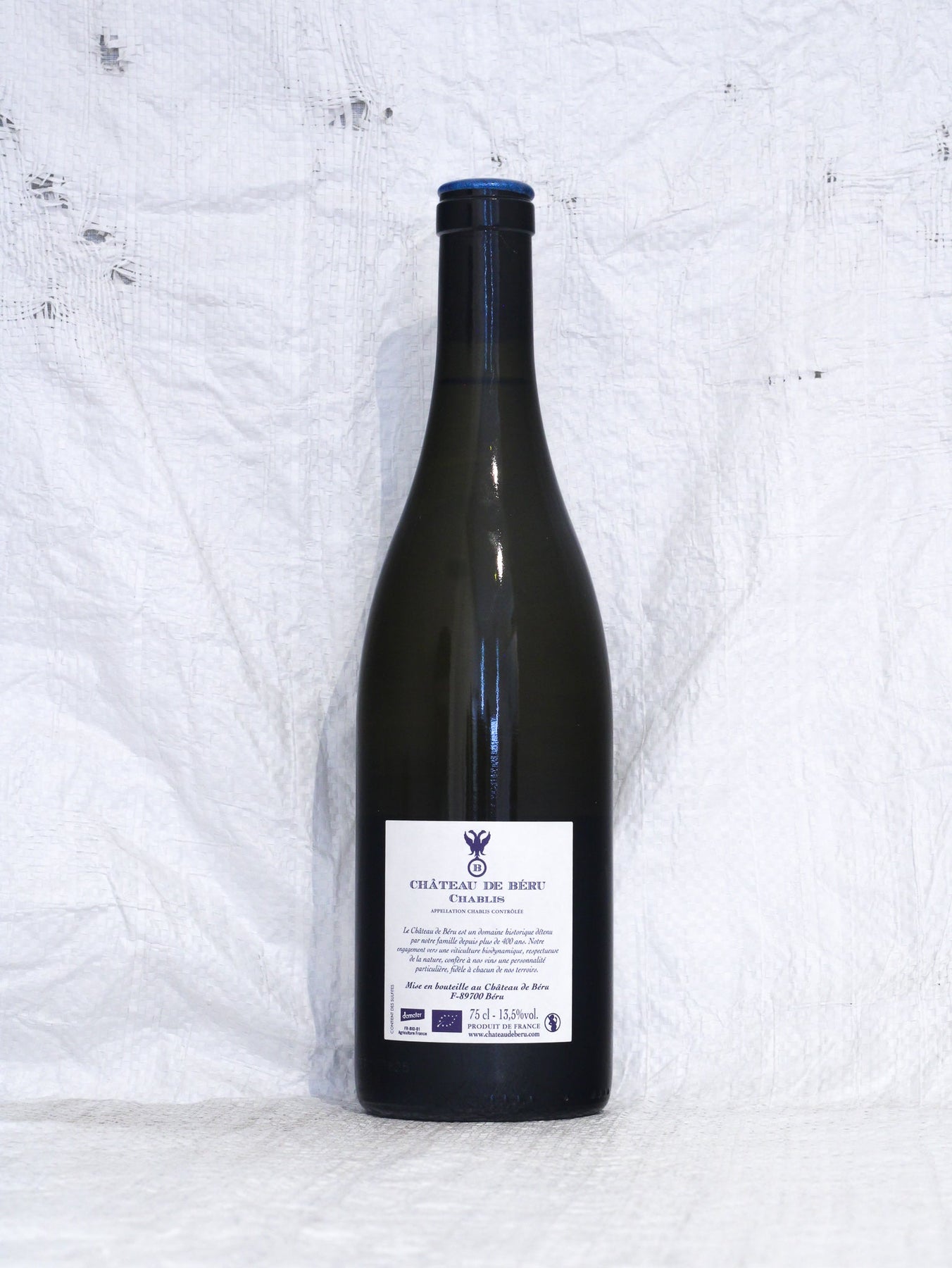 Terroirs de Béru 2023 von Château de Béru, Rückansicht der Chablis-Flasche mit Rückenetikett und Infos zum Biowein