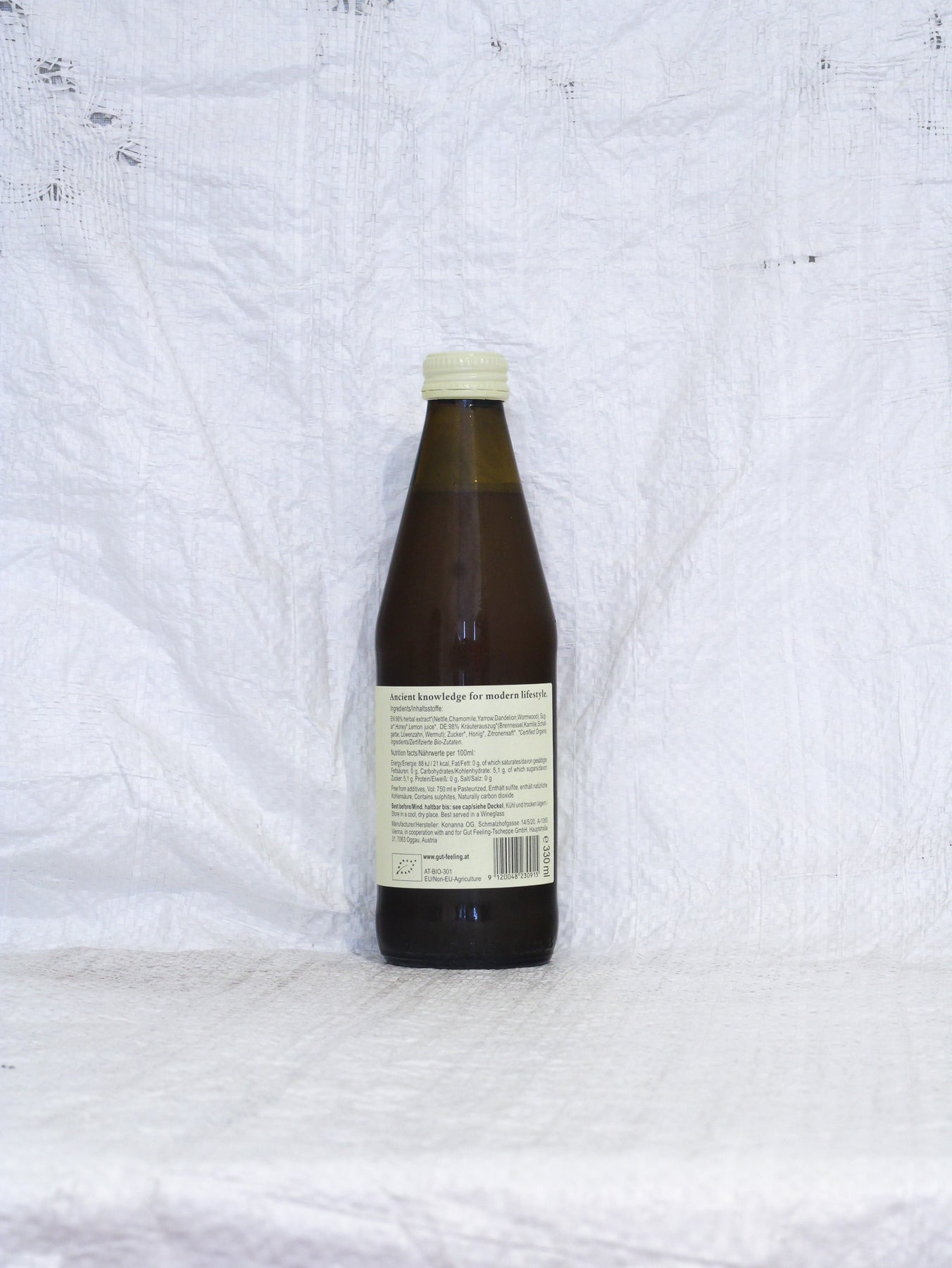 Kein Alkohol. Vergoren mithilfe von natürlichen Mikroorganismen. Ohne Zusätze und Filtration. Mit sanfter Kohlensäure. Ein Kräuterauszug aus Kamille, Schafgarbe, Löwenzahn, Wermut, Brennnessel, Eichenrinde und etwas Honig.